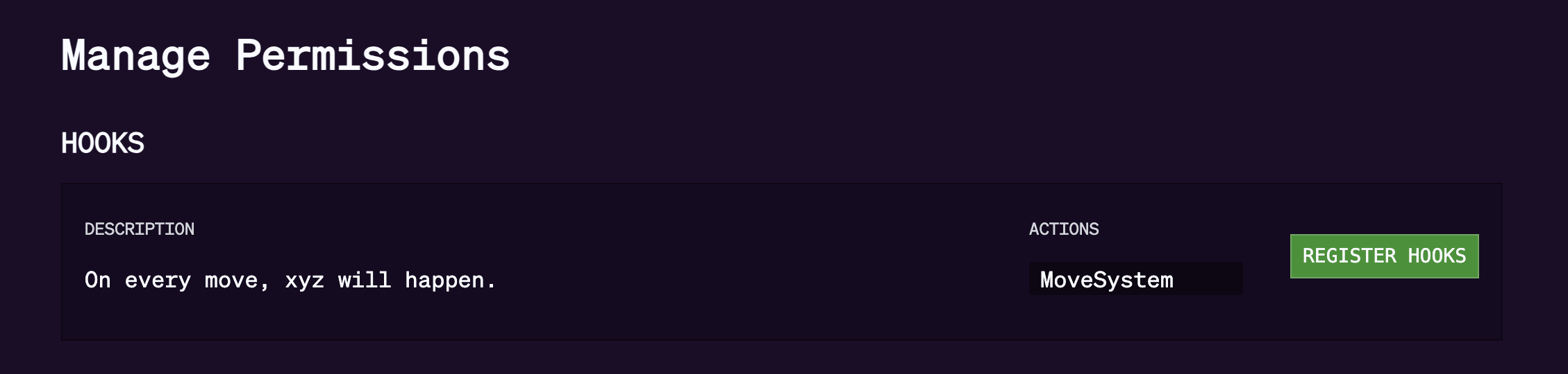 By inherting the hooks standard, your smart contract will be able to execute custom logic before and/or after specific player actions using onBeforeCallSystem and onAfterCallSystem.